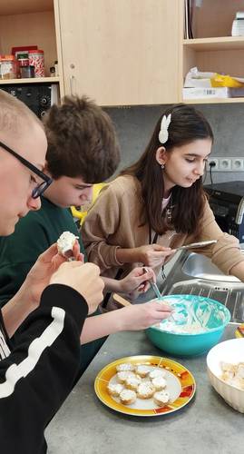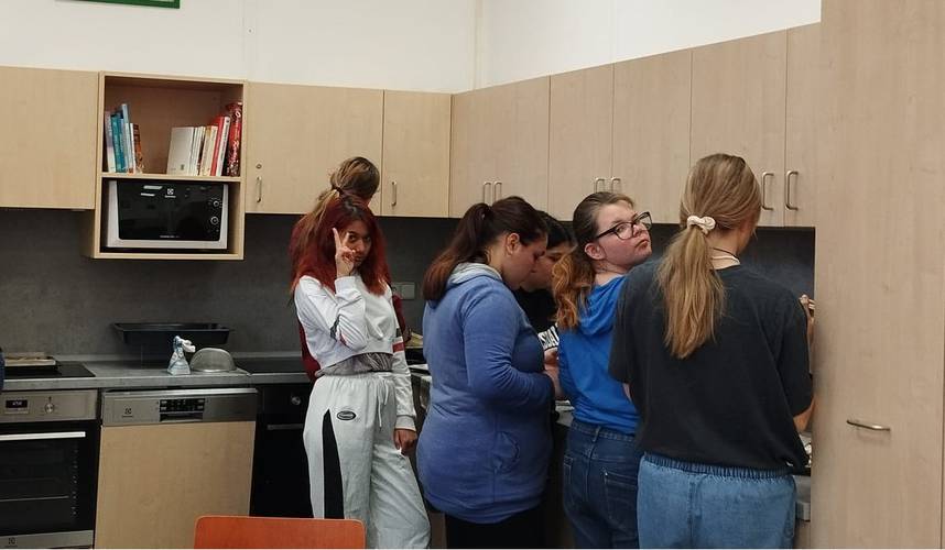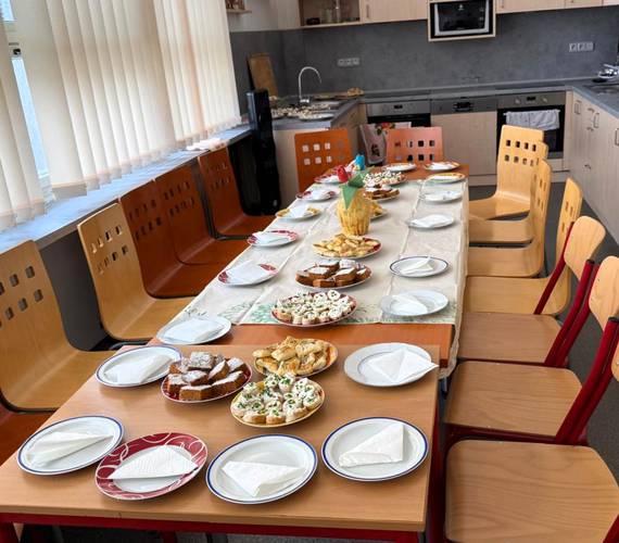 Po dokončení práce v dílnách se žáci přesunuli do kuchyňky, kde se zapojili do dokončení a servírování připraveného pohoštění. Všichni si pak společně pochutnali na mrkvovém moučníku, slaném pečivu z listového těsta a bylinkové pomazánce s pečivem. Na závěr dne skupina pracující v kuchyňce uklidila nádobí i celý prostor kuchyňky.
