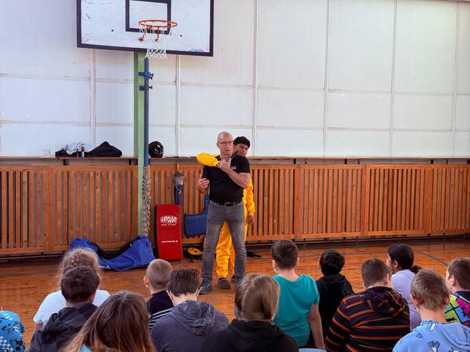 Následovala praktická část, během níž instruktor předváděl různé modelové situace a ukazoval bezpečné a základní techniky sebeobrany. Používal přitom cvičné a neškodné pomůcky, například makety útočných předmětů, aby žákům přiblížil, jak může napadení vypadat a jak na něj vhodně reagovat. Pod jeho vedením si žáci mohli vyzkoušet jednoduché obranné pohyby a únikové techniky, které jsou vhodné pro jejich věk a fyzické možnosti.